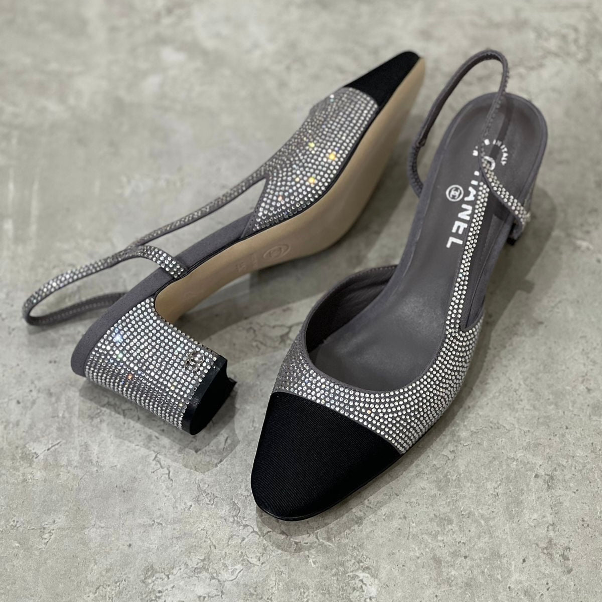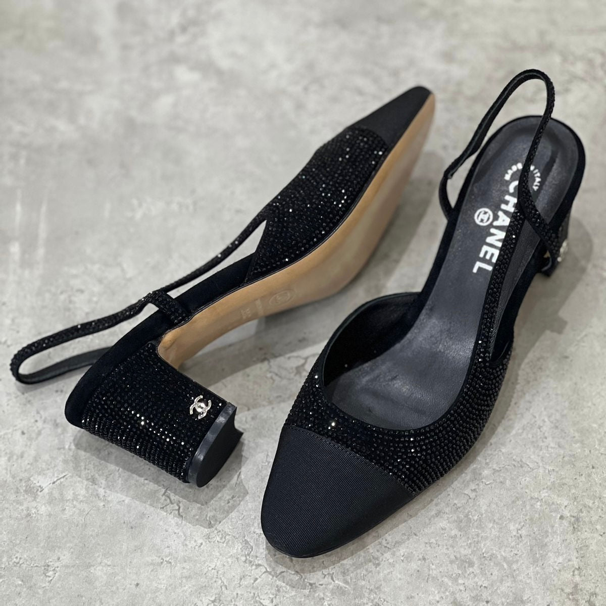 Add sparkle to sophistication with these heels inspired by the Chanel slingback collection. Drenched in black micro-crystals, these low block heels feature a pointed cap toe and elegant slingback strap. Finished with a mini CC emblem on the heel, they deliver glamour and grace in every step—perfect for evenings out or upscale events