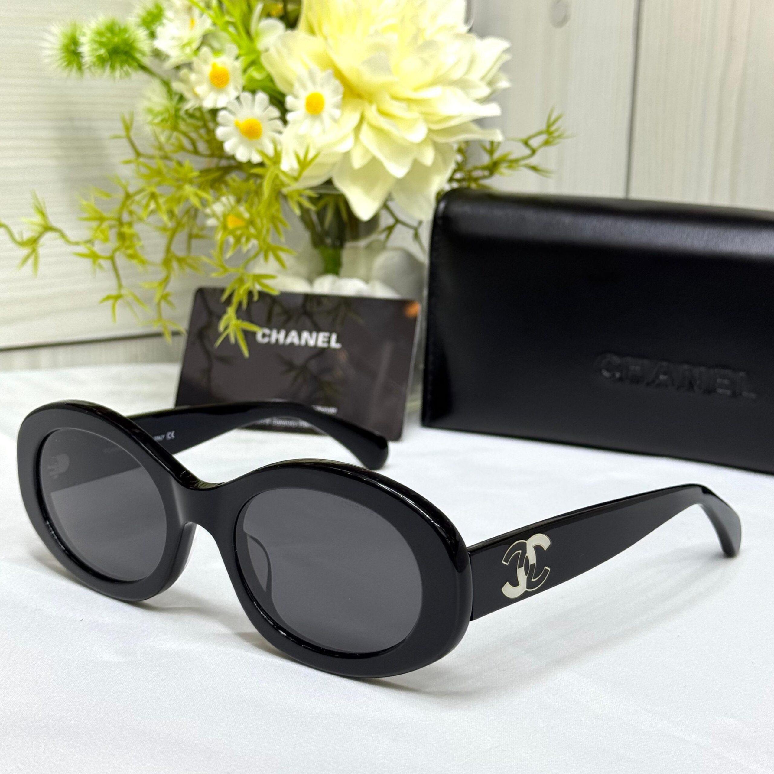 A timeless nod to vintage glamour, these inspired Chanel oval sunglasses feature a glossy black acetate frame and bold temples adorned with the signature interlocking CC emblem. Perfectly sleek and effortlessly iconic, they’re a must-have staple for any fashion-forward wardrobe
