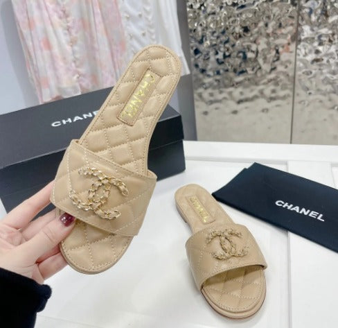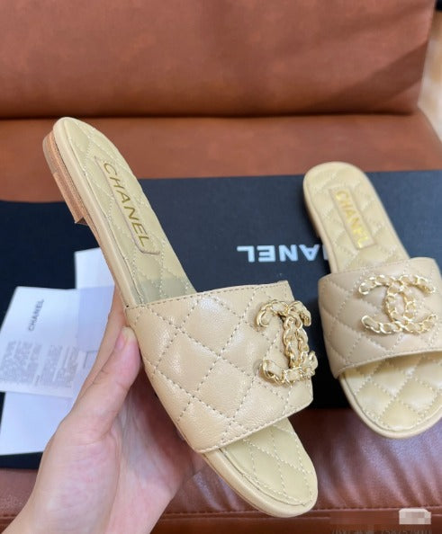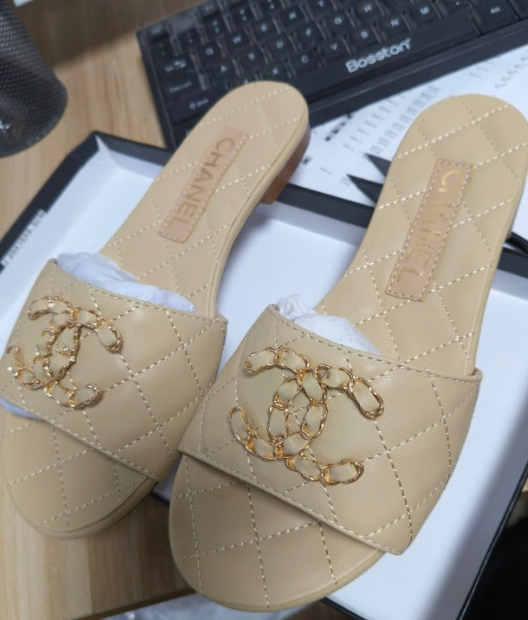 Step into elegance with these designer-inspired quilted leather slides. Featuring a luxurious diamond-stitched finish and bold gold-tone chain interlaced with the iconic CC emblem, these sandals draw inspiration from Chanel’s signature style—effortlessly combining comfort and couture. Perfect for elevating any casual or dressy look with a touch of Parisian sophistication.