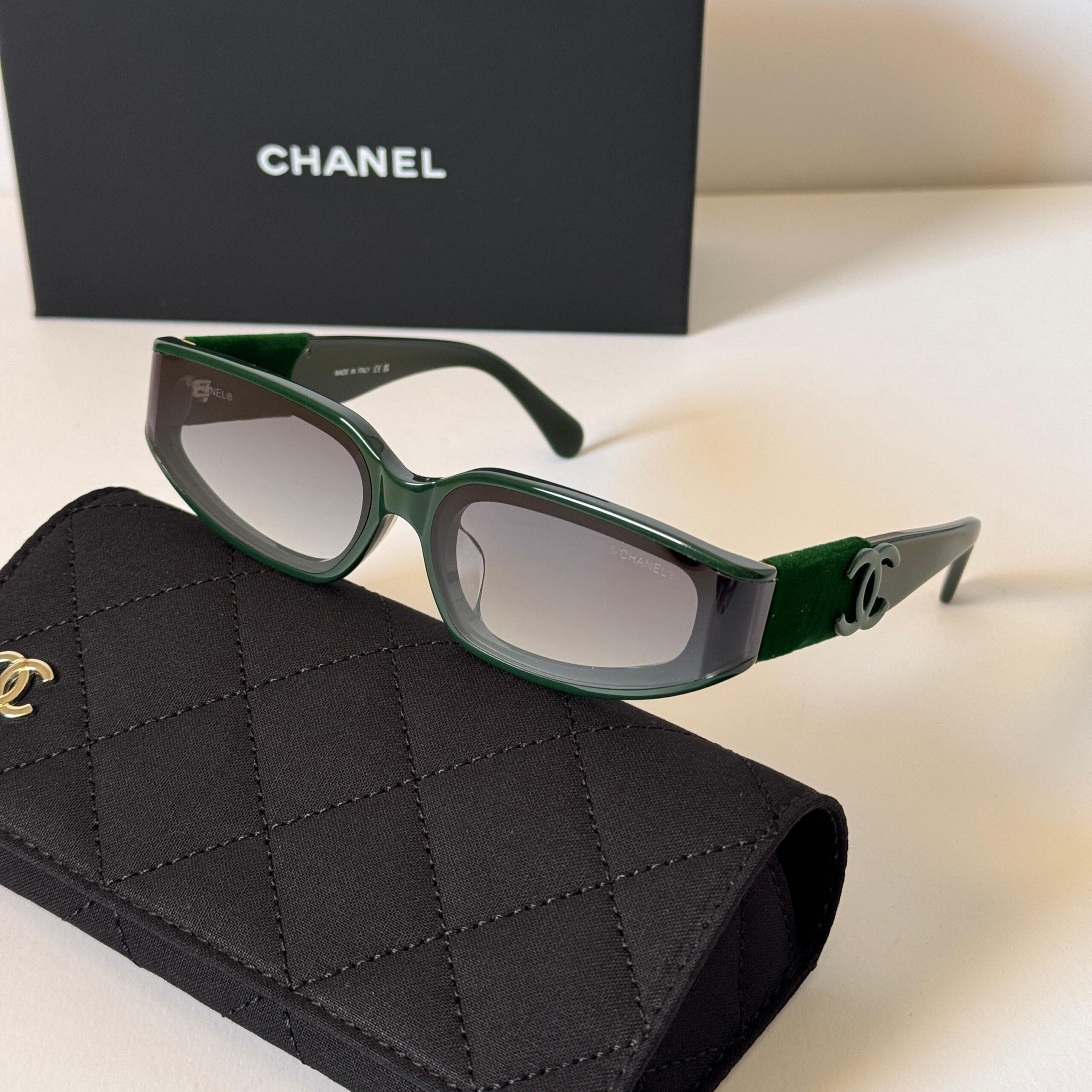 These designer-inspired Chanel sunglasses feature a sleek, slim rectangle frame with gradient lenses and plush velvet-covered arms adorned with bold CC logos. The contrast of soft texture and high-gloss black makes them an effortlessly chic statement for any fashion-forward look
