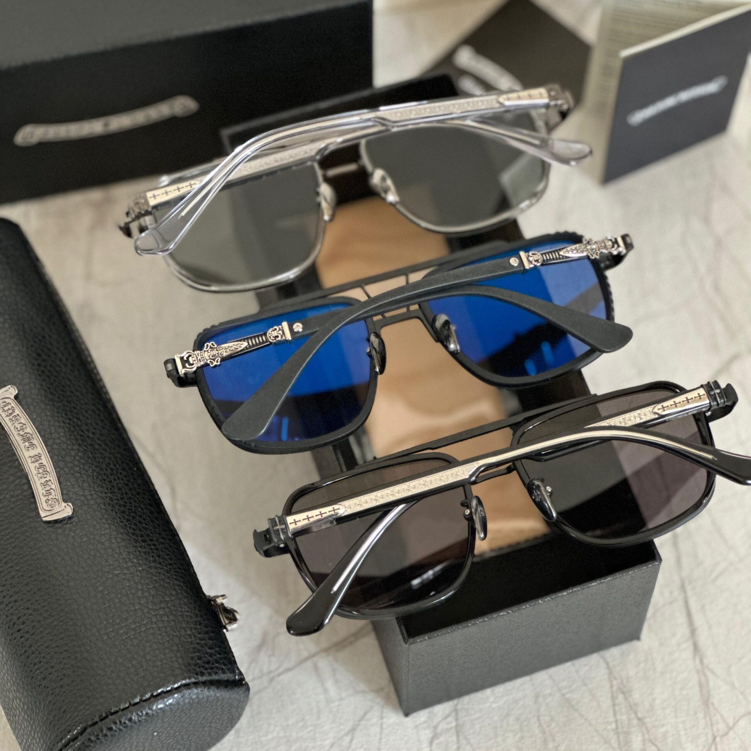 Inspired by the original Chrome Hearts aviator and clubmaster fusion frames, these sunglasses boast a strong statement silhouette featuring silver dagger-detailed temple bars and engraved arms. A true luxury accessory that combines handcrafted elements with a streetwise edge — perfect for bold personalities