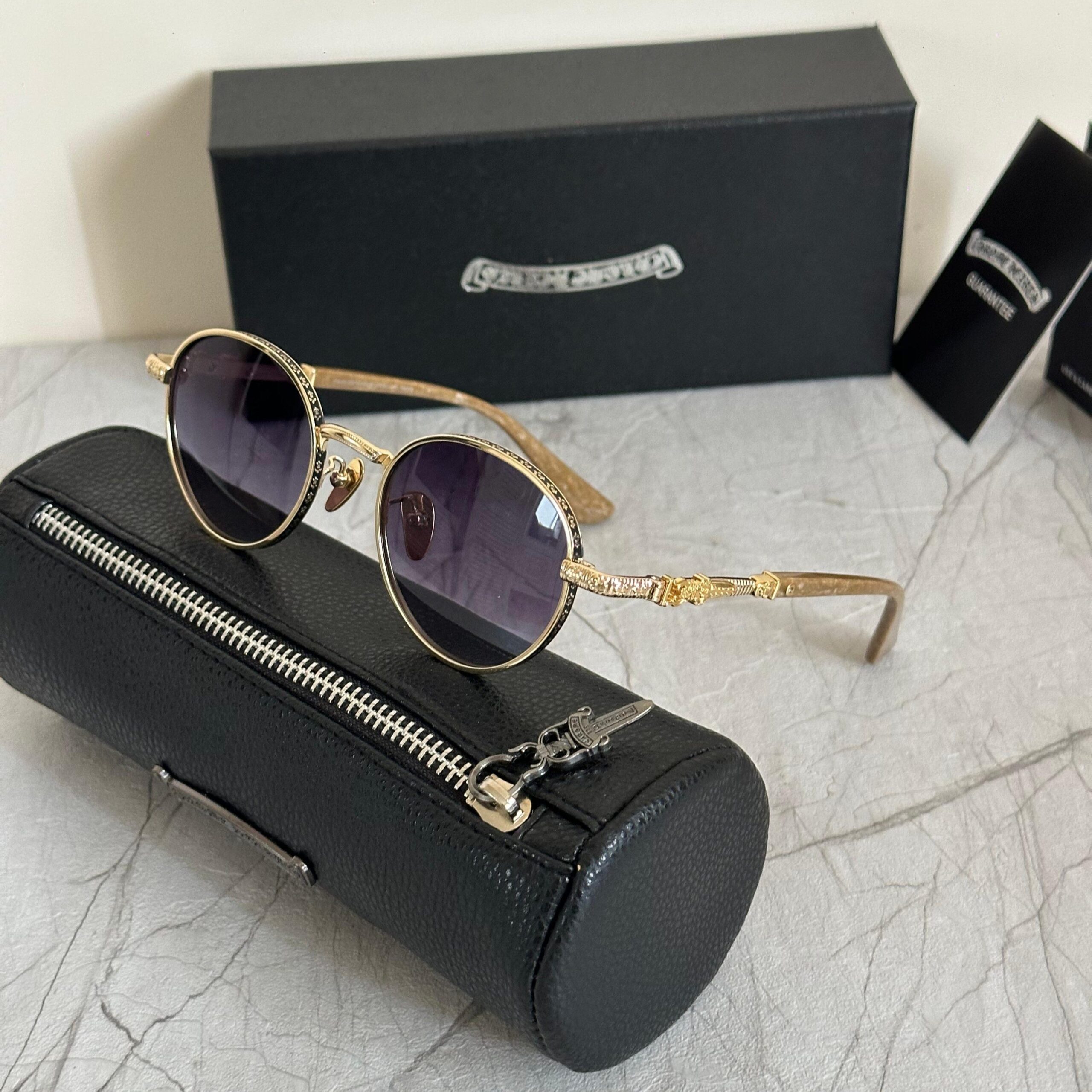 Inspired by the Chrome Hearts Ozzy model, these round-frame sunglasses feature intricate engraved detailing across the rims and temples. With their vintage silhouette and bold gothic accents, they channel unmistakable rocker-luxury energy. A true standout piece for fashion-forward collectors