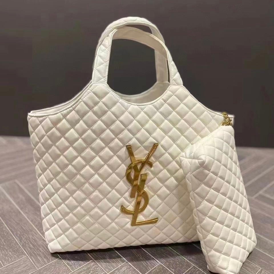 A bold and oversized statement piece, the YSL Icare Bag is crafted from luxurious quilted lambskin leather, offering a soft, slouchy silhouette that blends elegance with practicality. Featuring the iconic YSL monogram in gold-tone hardware on the front, this tote is designed with a spacious open-top interior, making it perfect for daily essentials or travel. The padded leather handles ensure comfortable carrying, while the removable zip pouch adds extra functionality.